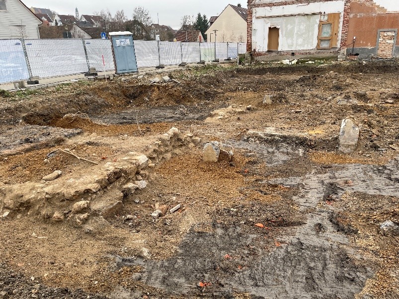 Das Grabungsteam der Firma E&B excav GmbH aus Freiburg hat mittlerweile rund die Hälfte des Baufeldes freigelegt. Dabei kamen alte Grundmauern aus Kalkbruchstein und Keramikscherben ans Licht, die nach ersten Einschätzungen aus dem späten Mittelalter stammen könnten.